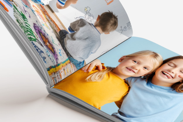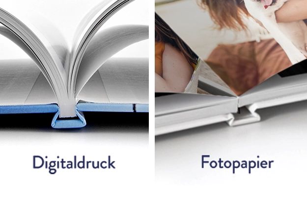Ein Digitalfotobuch wird im Digitaldruck erstellt und bietet gestochen scharfe gedruckte Bilder, mit glänzendem oder satinmattem Finish. Ein Echtfotobuch wird auf echtem Fotopapier belichtet, hier kannst du zwischen glänzendem und mattem Finish wählen. Dank der Layflat-Bindung lassen sich die Seiten komplett flach aufschlagen, ideal für Panoramabilder oder großformatige Designs. Beide Varianten bieten dir hochwertige Ergebnisse für unterschiedliche Ansprüche.