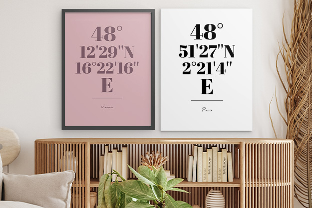 Wähle zwischen dem Koordinaten-Design, das besondere Orte in Szene setzt, und dem Love-Letters-Design für persönliche Worte, Namen oder Zitate. Beide Varianten sind modern, minimalistisch und machen deine Erinnerungen zu stilvollen Hinguckern, für dich selbst oder als individuelles Geschenk.
